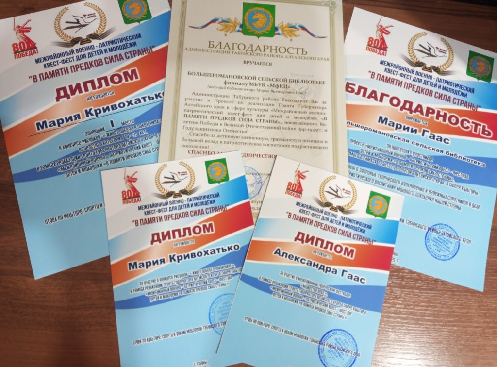 Большеромановская сельская библиотека приняла участие в конкурсе рисунков «Живет Победа в поколениях». Участником номинации «Наследники Великой победы» в возрастной категории 18-35 лет стала Кривохатько Мария Валерьевна. Рисунок, выполненный графитным карандашом, раскрывает трагизм военного времени и в то же время вызывает чувство гордости за отвагу и героизм русского солдата. Рисунок занял первое место и был награжден дипломом и памятным подарком.