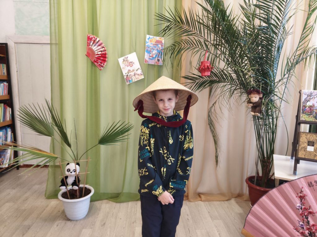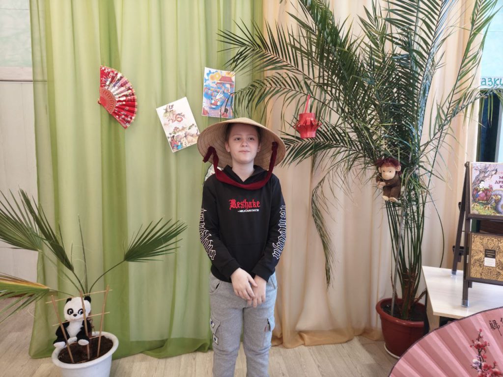 Зал библиотеки превратился в уголок Китая: яркие веера, символ страны — панда, и книжная выставка с удивительными китайскими сказками создали неповторимую атмосферу.