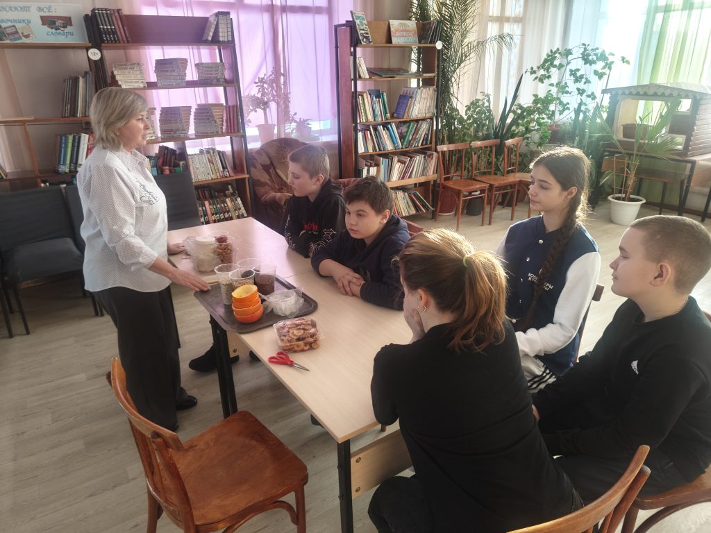 Затем ребята с большим интересом и энтузиазмом, под чутким руководством заведующей библиотекой Белой Т.Д.  приступили к главному — изготовлению эко кормушек и питательной смеси из зерен, несоленого сала.