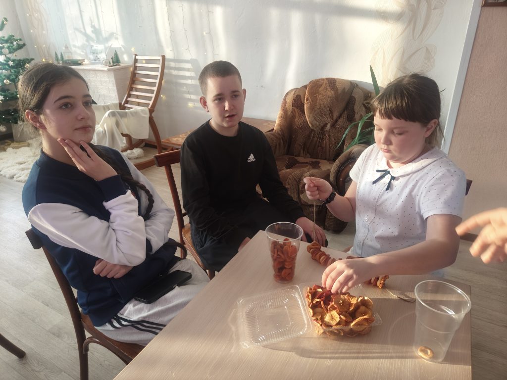 Смастерили «вкусные» бусы из сушенных яблок и кураги.