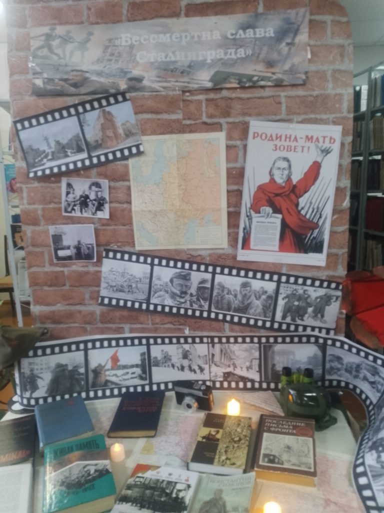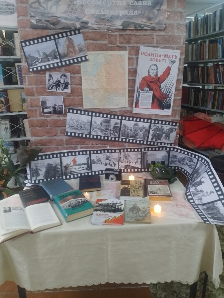 Абонемент Табунской межпоселенческой библиотеки стал площадкой для обзора выставки, посвящённой Сталинградской битве – поистине величайшему и переломному сражению Великой Отечественной и всей Второй мировой войны. С 17 июля 1942 года по 2 февраля 1943 года в Сталинграде кипели ожесточённые бои, завершившиеся триумфальной победой советских войск над немецко-фашистскими захватчиками.
