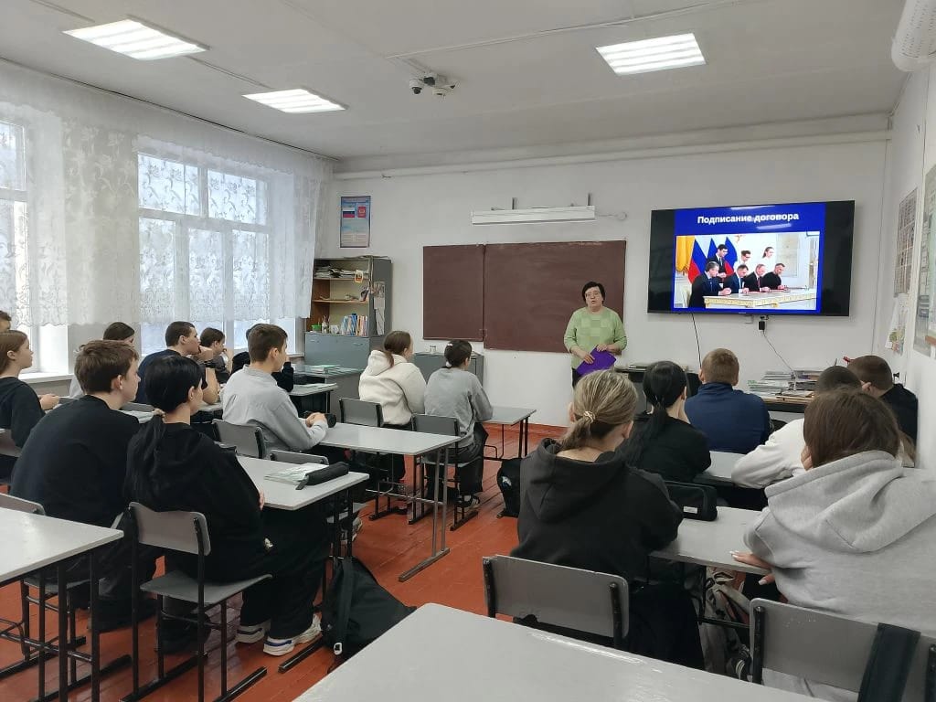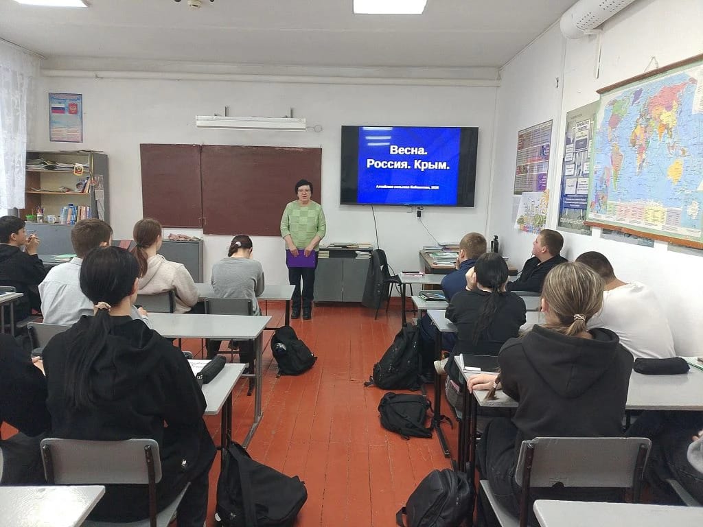 Библиотекарь рассказала, что 18 марта 2014 года по итогам общенародного референдума был подписан Договор о принятии Республики Крым и города-героя Севастополя в состав Российской Федерации. Это решение стало знаковым в истории нашей страны и укрепило единство российской нации. Также участники мероприятия познакомились с историей Крыма, историческими событиями, происходившими на его территории и ставшими предпосылками к сегодняшнему дню.